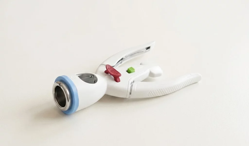Po odpowiednim spozycjonowaniu napletka wewnątrz cylindra urządzenia, lekarz zwalnia blokadę bezpieczeństwa i aktywuje mechanizm. W ułamku sekundy stalowe ostrze wykonuje idealnie równe cięcie okrężne, a system mikro-zszywek zamyka brzegi rany. Dzięki temu naczynia krwionośne są niemal natychmiastowo zabezpieczone, co redukuje krwawienie do absolutnego minimum. Całość trwa znacznie krócej niż tradycyjne manewrowanie skalpelem.